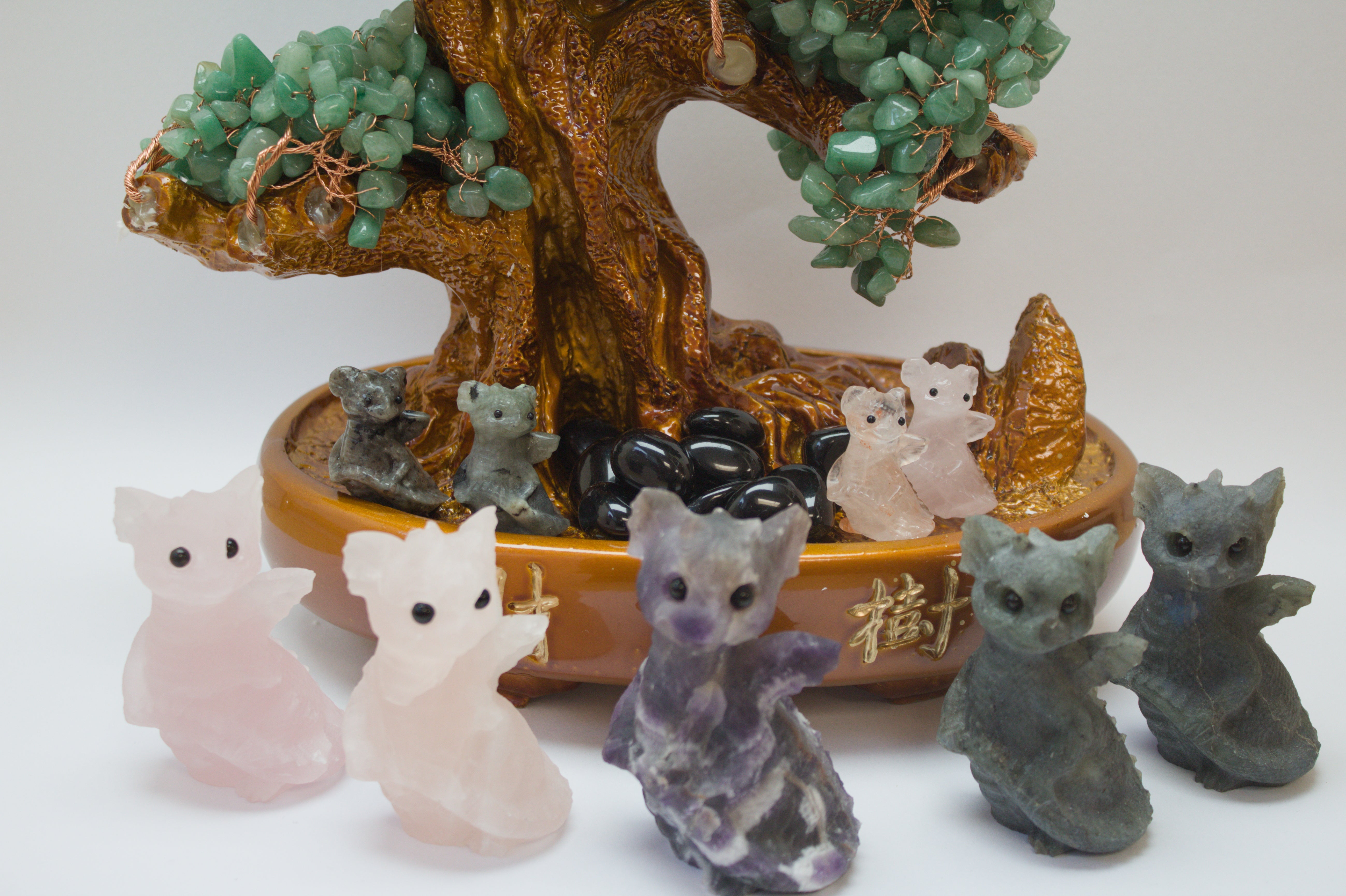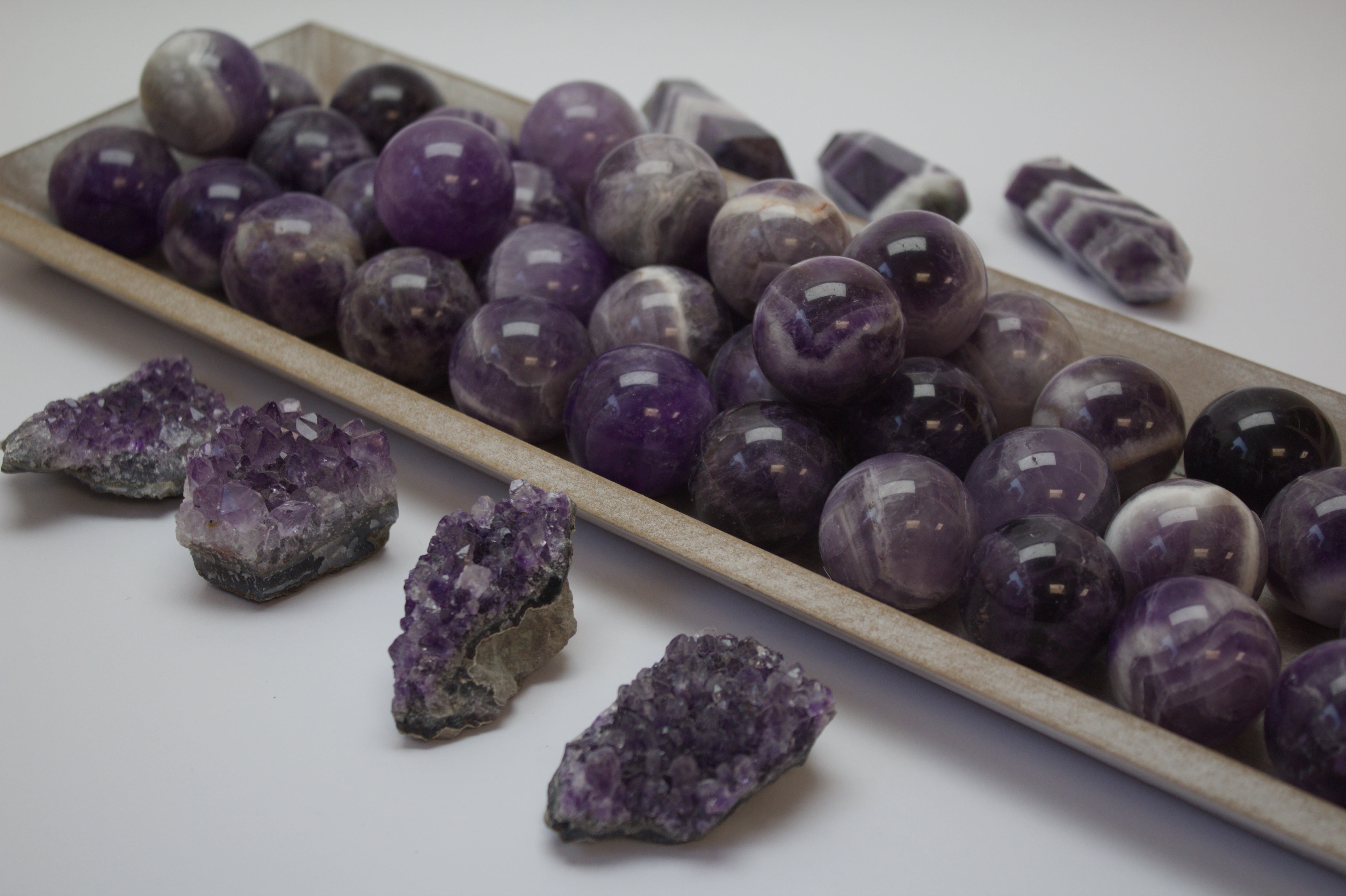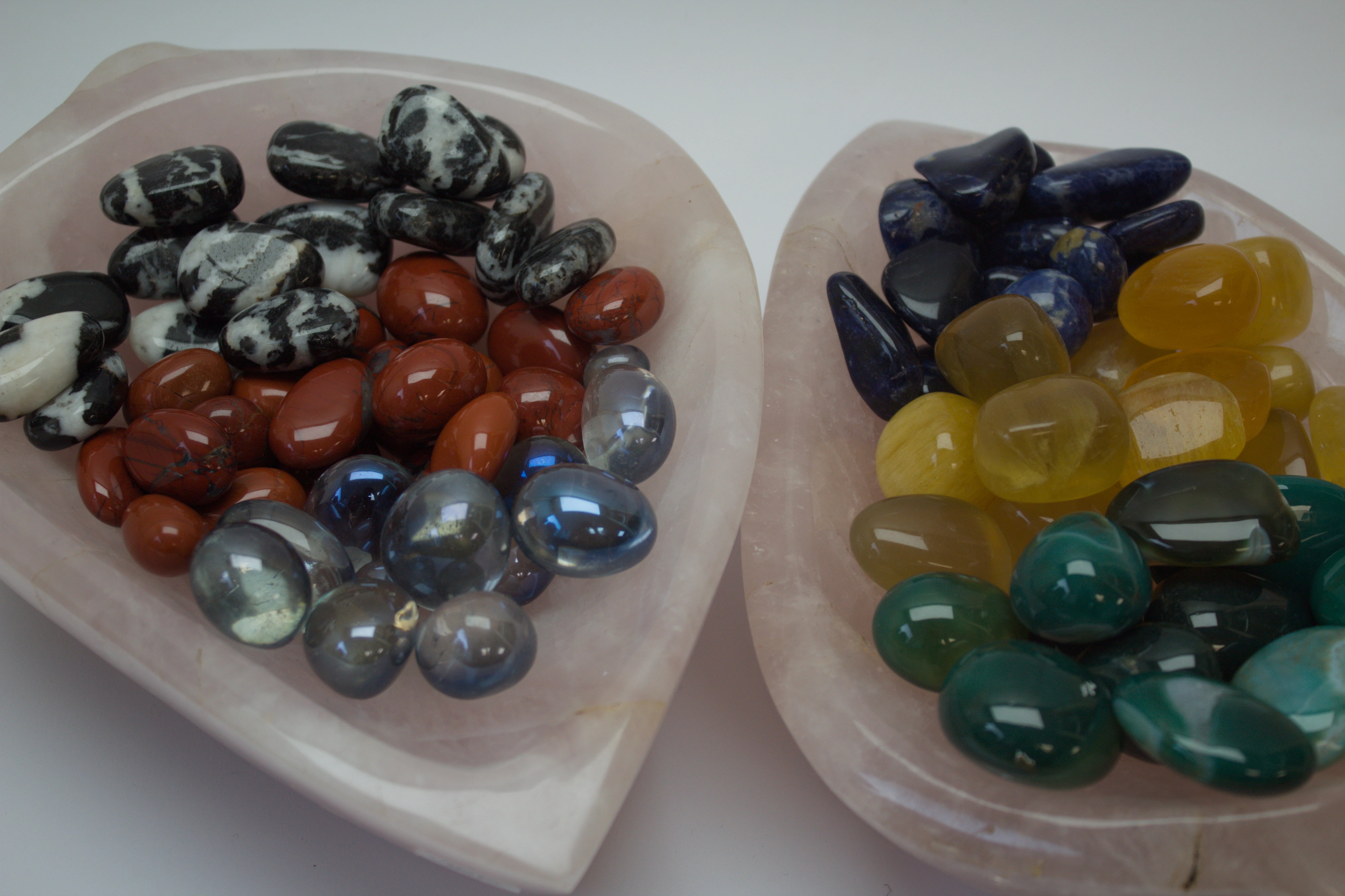 Vi sælger sten og krystaller i forskellige størrelser og former.