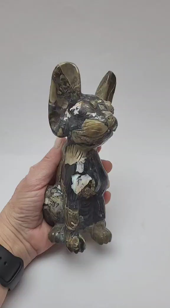Denne smukke hundeskulptur skabt i Vulkano Agat bærer en kraftfuld energi, der kombinerer jordens stabilitet med vulkansk transformation.
